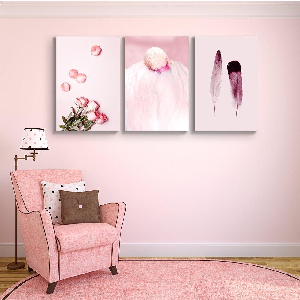3 Panel Canvas Wall Art - Flamingo Triptych Series | Pink Rose Petals Sleeping in Feathers - Giclee Print Gallery Wrap Modern Home Art Ready to Hang - 24"x36" x 3 Panels