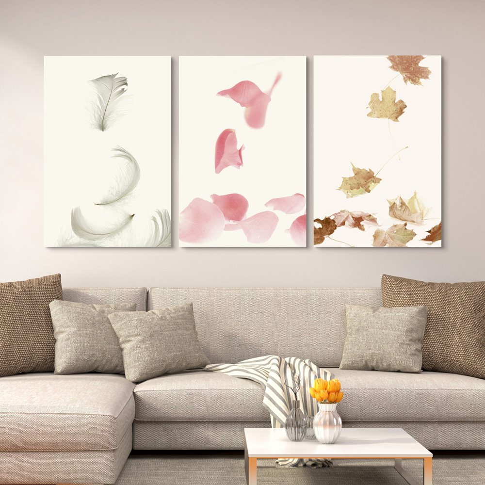 3 Panel Canvas Wall Art - Pink Flower Petals Feathers and Leaves - Giclee Print Gallery Wrap Modern Home Art Ready to Hang - 24"x36" x 3 Panels