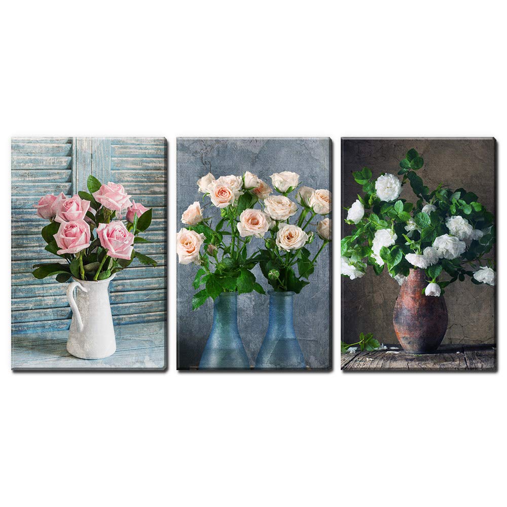 3 Panel Canvas Wall Art - Vintage Style White and Pink Roses - Giclee Print Gallery Wrap Modern Home Art Ready to Hang - 24"x36" x 3 Panels