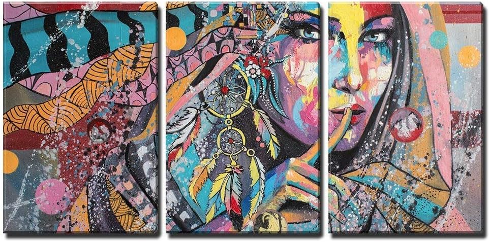 3 Piece Canvas Wall Art - Fantasy Portrait on a Theme of Dream Catcher Talisman of North American Lacota Tribe - Modern Home Art Stretched and Framed Ready to Hang - 24"x36"x3 Panels