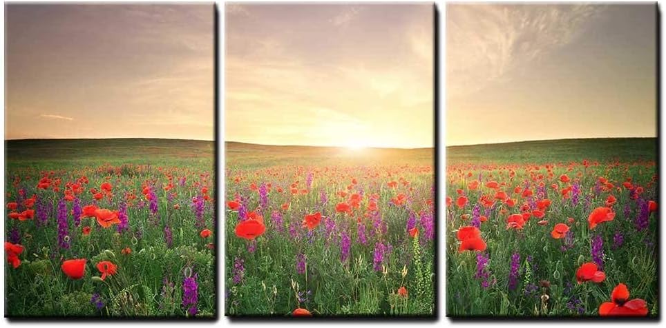 3 Piece Canvas Wall Art - Field with Grass, Violet Flowers and Red Poppies Against The Sunset Sky - Modern Home Art Stretched and Framed Ready to Hang - 24"x36"x3 Panels