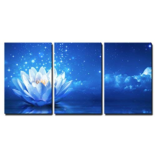3 Piece Canvas Wall Art - Lotus Flower Floating on Water by Moonlight - Modern Home Art Stretched and Framed Ready to Hang - 24"x36"x3 Panels
