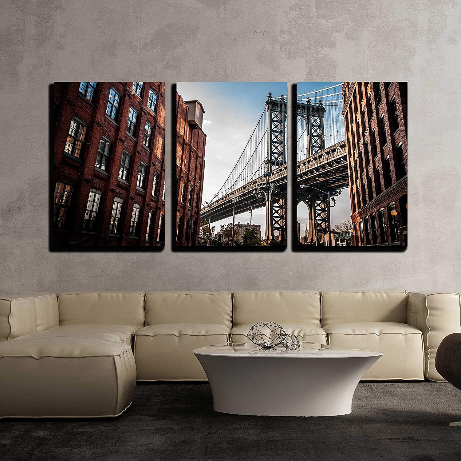 3 Piece Canvas Wall Art - Manhattan Bridge Seen from a Narrow Alley Enclosed by Two Brick Buildings - Modern Home Art Stretched and Framed Ready to Hang - 24"x36"x3 Panels