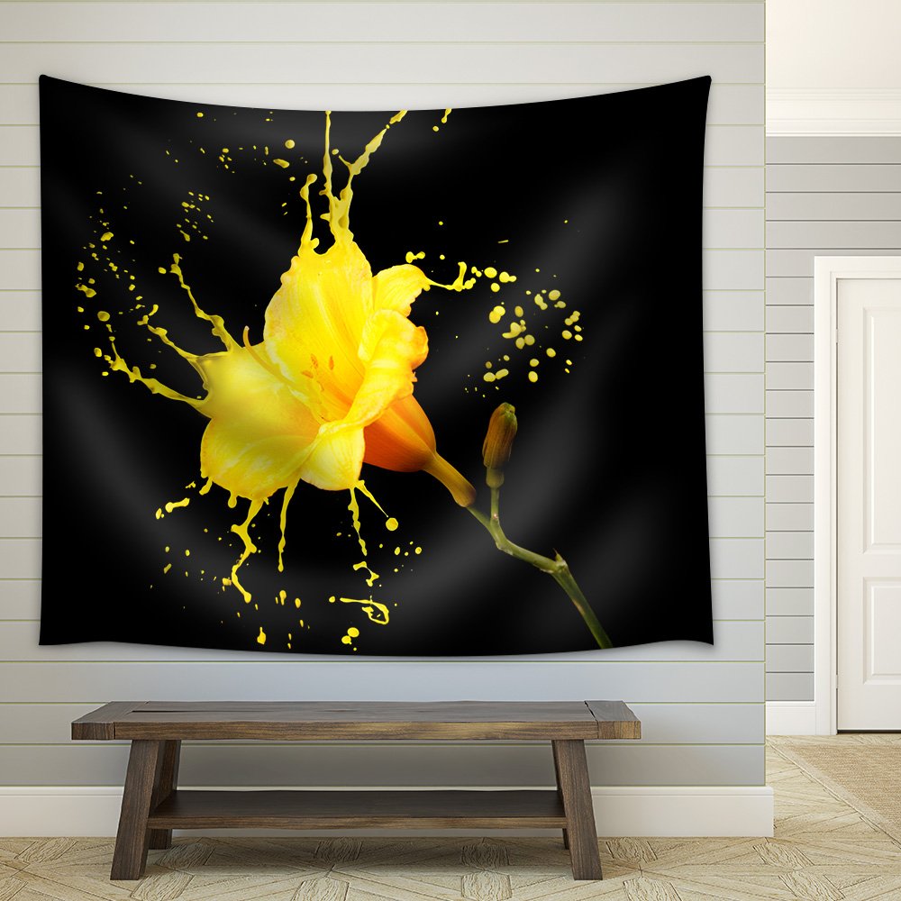 Bright Flower with Yellow Splashes on Black Background - Fabric Wall Tapestry Home Decor - 51x60 inches