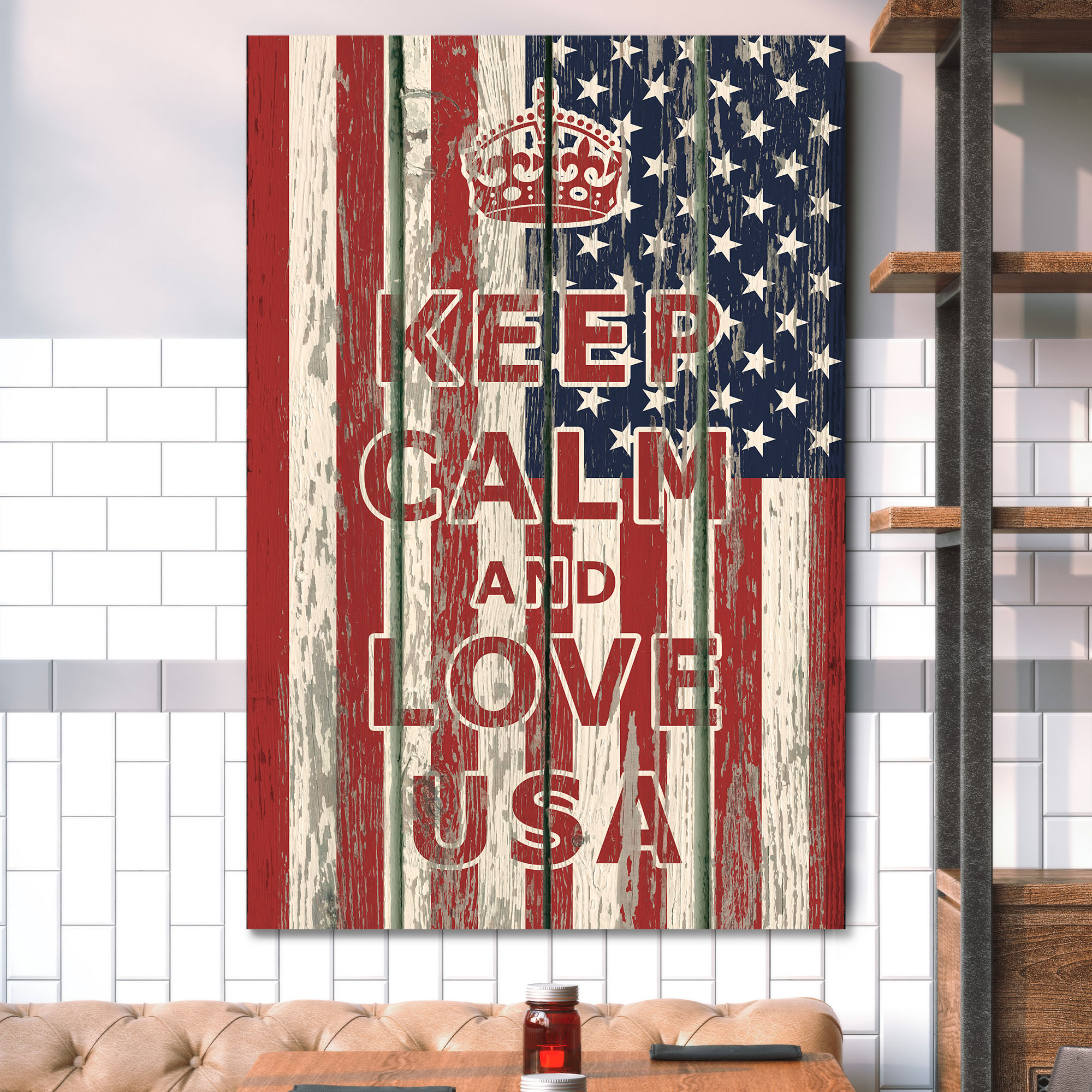 Canvas Prints Wall Art - Keep Calm and Love USA Quote on Vintage Wood Board Style USA Flag - 36" x 24"