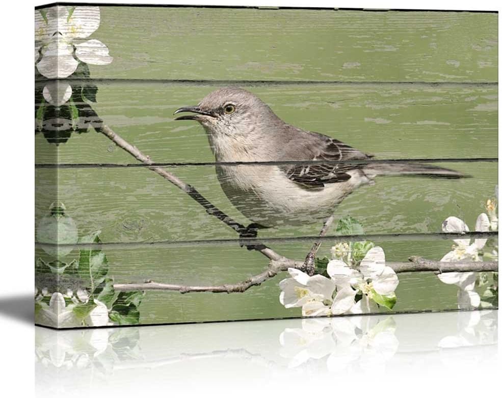Canvas Wall Art - Grey Bird Sitting on a Flower Branch on Vintage Wood Textured Background - Rustic Country Style Modern Giclee Print Gallery Wrap Home Art Ready to Hang - 32" x 48"
