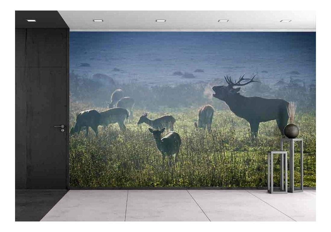 Deer with Herd Roaring on The Meadow at Sunrise - Removable Wall Mural | Self-Adhesive Large Wallpaper - 100x144 inches