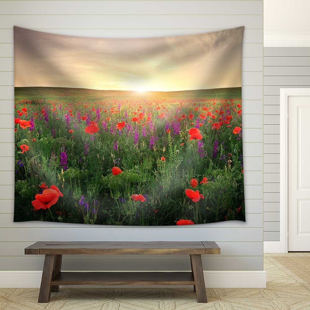 Field with Grass, Violet Flowers and Red Poppies Against The Sunset Sky - Fabric Wall Tapestry Home Decor - 68x80 inches