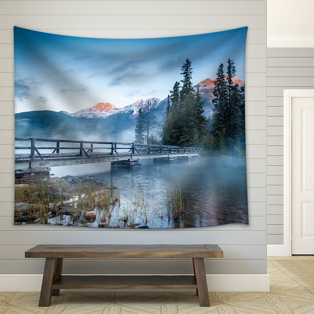 First Glimpse of a Golden Sunrise on a Misty and Foggy Morning at Pyramid Lake in Jasper National Par - Fabric Wall Tapestry Home Decor - 51x60 inches