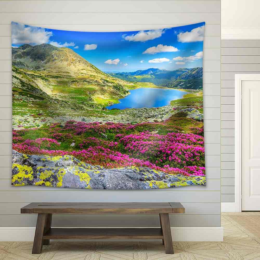 Glacier Lake,High Mountains and Stunning Pink Rhododendron Flowers,Retezat National Park,Carpathians,Romania,Europe - Fabric Wall Tapestry Home Decor - 51x60 inches