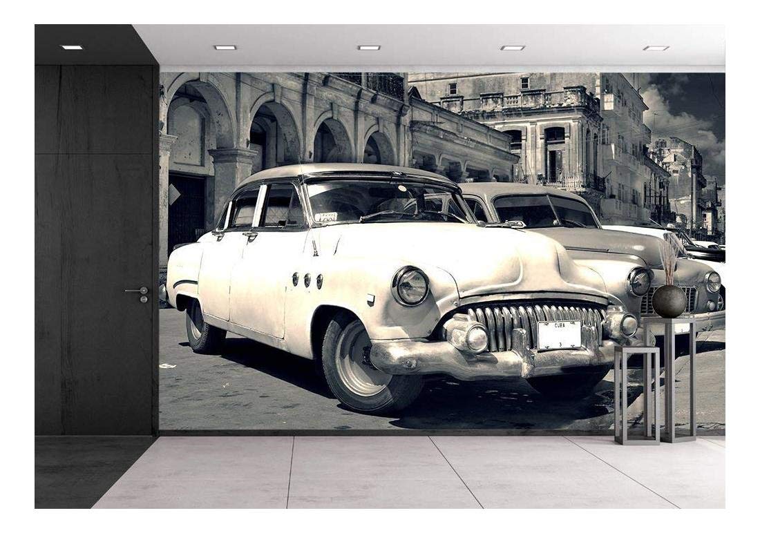 Panoramic View of Shabby Old Havana Street with Vintage Classic American Cars - Removable Wall Mural | Self-Adhesive Large Wallpaper - 100x144 inches