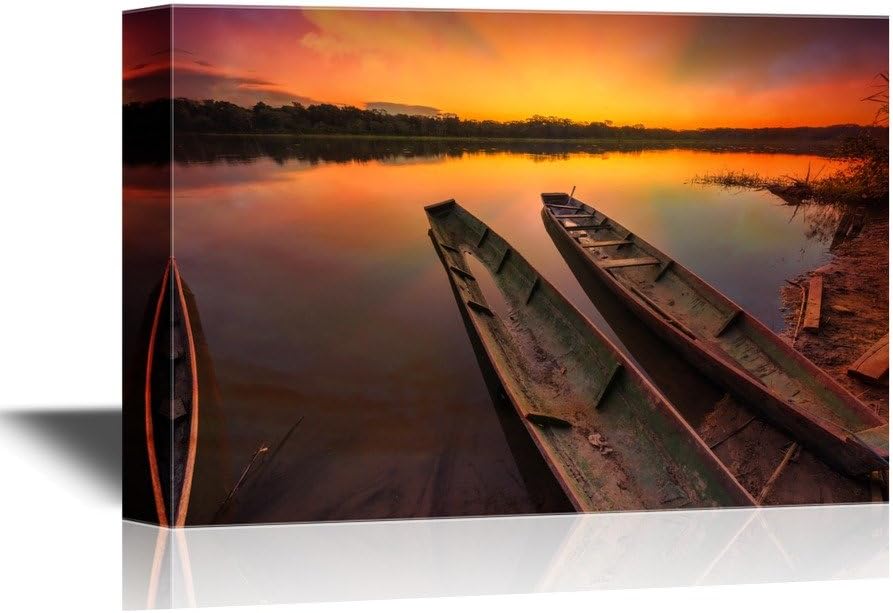 Canvas Wall Art - Dramatic Sunset in The Amazon Rain Forest with Two Canoes - Gallery Wrap Modern Home Art | Ready to Hang - 16x24 inches