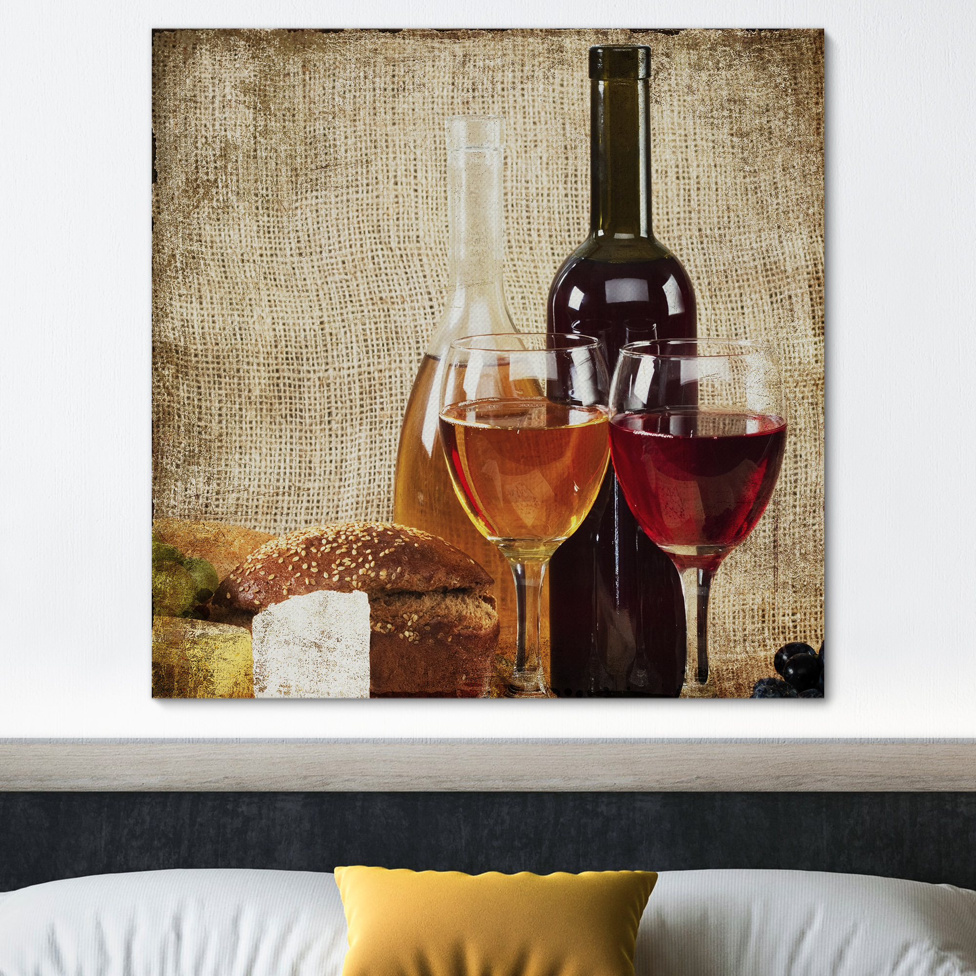 Square Canvas Wall Art - Rustic Style Wine in Glasses with Breads and Bottles - Giclee Print Gallery Wrap Modern Home Art Ready to Hang - 16x16 inches