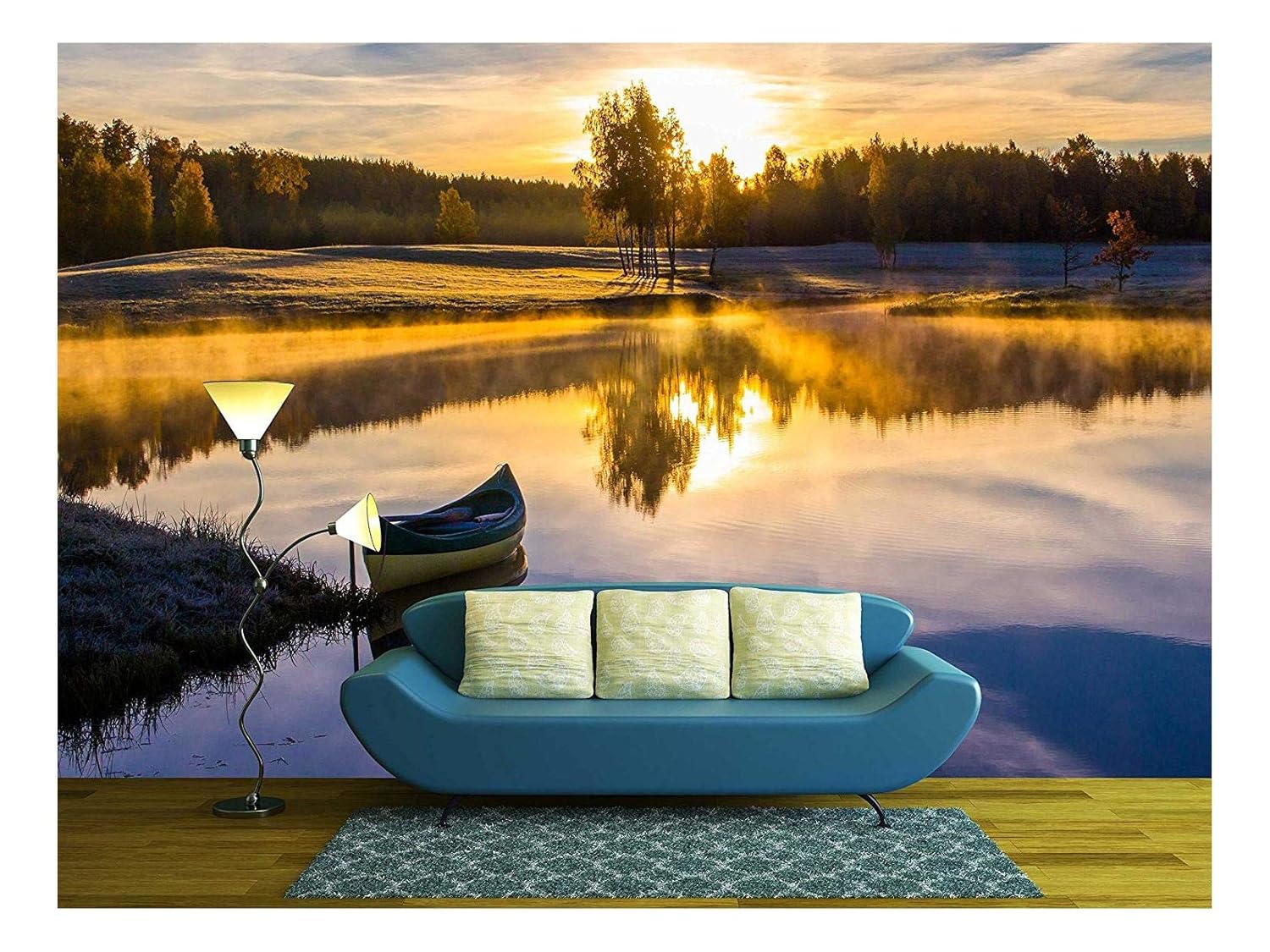 Sunrise Over The Lake with a Boat - Removable Wall Mural | Self-Adhesive Large Wallpaper - 100x144 inches